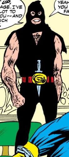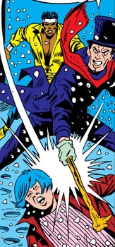 (Hero for Hire I#7) - Disguising himself as a man from the 19th century wearing a top hat and brandishing an oak cane, he resolved to find a child and start beating him in public because in the 19th century, if a man were seeing beating a child, a crowd would have formed to stop him. "Marley" theorized that no one would care if he were seen beating a child. Finding a boy named Timmy who was selling newspapers in Harlem, "Marley" began to assault Timmy, striking him with his cane. The local hero for hire Luke Cage witnessed the attack and when "Marley" insisted he had the right to beat Timmy, Cage slapped him in the face. "Marley" could tell Cage was strong but declared that he was "a member of her Majesty's Fifth Northumberland Fusiliers" and struck Cage with the cane using all the force he could muster. Much to his surprise, Cage wasn't even hurt by the attack and Cage smashed the cane into pieces. Calling him a worm, Cage punched "Marley" in the stomach. "Marley" yielded to Cage and explained that he beat Timmy because the boy had asked for 15 cents for a newspaper when in his mind, a newspaper cost only 2 cents. When Cage asked who he was, he claimed to be Marley, "a dealer in chains." Claiming he had an appointment with his partner who was "very stingy with his time," Marley departed into the streets while Cage took Timmy to his friend Dr. Noah Burstein for care. As he left, Marley was impressed to see someone had been willing to help a person in trouble.