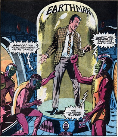 The next thing Melvin Burns knew, he found himself locked in a cage on Mars; as other Martians gathered around to see their zoo's newest exhibit, the Martian told the "brainless Earthling" (Burns) that he was the "treasure"!