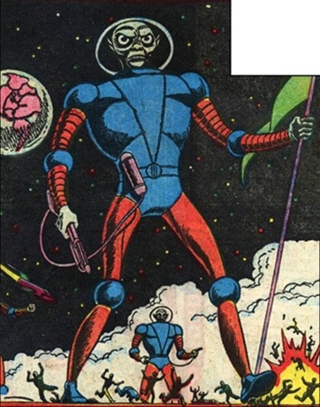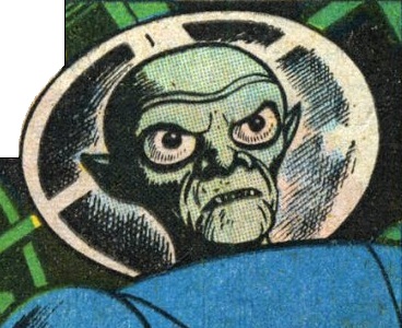 Powers/Abilities: Armed with energy-projecting handguns, these warlike Martians displayed no paranormal abilities of their own. They possessed rocket-ships capable of flying in Earth's atmosphere, which were armed with atomic bombs and destructive energy beams; although technologically advanced in comparison to Earth, they had not yet achieved interplanetary travel -- their rocket-ships were only able to reach Earth because their planet had temporarily been pulled into closer proximity.