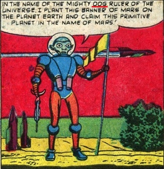 Journey into Unknown Worlds I#7/1, p5, pan1 (Martian invasion leader plants banner on Earth and invokes Oog's name [underlined in RED])