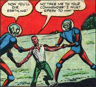 Although these Martians invoked the name of their leader Oog several times (see third image above), they probably had no connection with that earlier Martian invasion in the Captain America story -- I can't believe the exact same circumstances occurred just a few years after that story. I'd prefer to think that this story did take place in Reality-616 (mainstream Marvel Universe), but it's just a fictionalized version of the events from the Captain America adventure, and was published as a comic book story by the Earth-616 version of Timely/Atlas Comics.