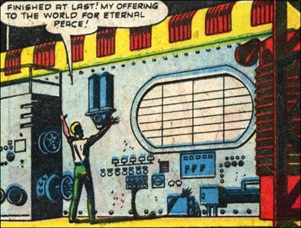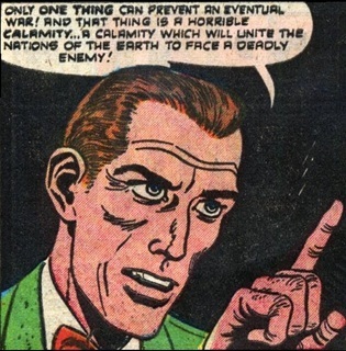 One of the world's top scientists, "Heath Russell" (see comments) had been a soldier during World War II; having witnessed the horrors of warfare, he conducted college lectures where he talked about world peace, and he thought that another global conflict would completely destroy Earth. He believed that the only thing that would save the world was for all the nations of Earth to unite against a common enemy. From his years of studies, "Russell" secretly learned that there were creatures on Mars who would attack Earth, if not for the fact that their rocket-ships could not travel the tremendous distance. Figuring that an invasion from the red planet would be just the thing to unite Earth, he built the Atomic-Powered Magnetic Dynamo to pull the planet Mars closer to Earth, so that the Martians could more easily attack the world. But "Russell" had not taken into consideration that the Martians had superior weaponry, and the invaders soon began to overwhelm Earth's defenses. In an attempt to undo the damage he had unintentionally caused, "Russell" reversed the action of his machine and pushed Mars back into its regular orbit, then he shoved the invasion force's leader into the machine, which caused a short-circuit that destroyed his Atomic-Powered Magnetic Dynamo. Upon learning that their leader was dead and their supply-lines were cut, the remaining Martian invaders realized they were unable to ever reach their home-world again, so they chose to fly their rocket-ships into deep space to die, rather than perish on a foreign world. With the extraterrestrial threat ended, the world returned to "normal" -- nations once again threatened and distrusted each other, just as they had before "Russell" tried to bring them "peace". --Journey into Unknown Worlds I#7/1 |