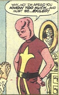Goad had sent an invoice for a Queen Anne chair with matching footstool to the recently-deceased Charles Rompol; but a man came into his shop and claimed that the bill was in error--the man revealed that he was the late Charles Rompol, and he had never made the purchase! At first thinking he was dealing with a madman, Goad soon learned that the stranger was a Martian who had the ability to assume any physical form. When the Martian showed him his true form, Goad begged for forgiveness and pleaded for the Martian to leave him alone; but the Martian told Goad that he now knew too much, and would have to be "exiled". The final fate of Eban Goad remains unrevealed (see comments). --Strange Tales I#66/1 |
