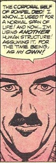 Powers/Abilities: Presumably like others of his race, this humanoid Martian could somehow assume the physical form of an Earthling and use it for a normal span of life; when that person died "a so-called normal death," the Martian could then assume the form of another "human structure" (see comments).