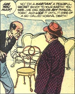 Goad experienced a momentary fright, but his reason intervened and he told the stranger that he knew Rompel to be dead because he had seen his name himself in the obituaries. The Martian explained that he had been using Rompel's "corporal self," but he was now using another "human structure" as his own for the time being. When the disbelieving Goad questioned the stranger's sanity, the stranger told him of his alien nature--this only led the doubting Goad to believe the stranger was using an outlandish lie so he could get out of paying the bill.