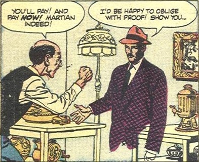 After he received the invoice, the Martian (in his new unidentified human form) knew the bill was an error, for he had never made such a purchase, so he went to pay a visit to Goad's shop.