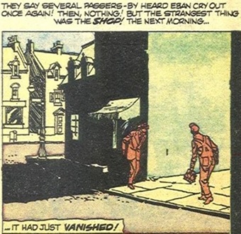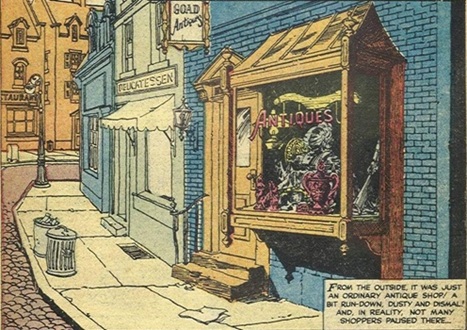 It was a run-down, dusty, and dismal antique shop owned by Eban Goad; not many shoppers stopped there, so Goad came up with a swindling scheme to supplement his income. But a customer--actually a Martian--came to the shop to contest a phony bill, and then sent Goad into "exile". The next morning, pedestrians walking along the sidewalk noticed an empty lot where Goad's antique shop had once been (see comments). --Strange Tales I#66/1 |
