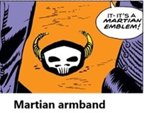 At least one Martian wore an armband with a skull emblem (see comments), and was seen carrying a rifle-like weapon with a forked trident at its end; however, no other examples of technology, weaponry, or civilization were seen.
