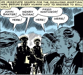 Although the Martian in the main image was colored orange, all subsequent story-panels had them colored red--this was likely a coloring error, but since they could alter their appearances and impersonate humans, obviously they had the power to change their color as well.