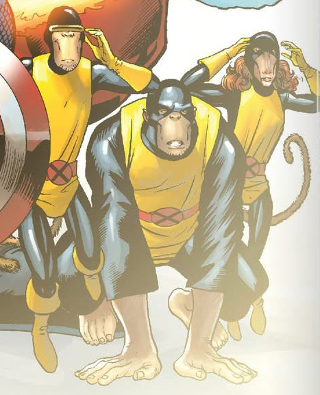 Group Membership: X-Simians (Angel/Warren Worthington III, Beast/Henry McCoy, Cyclops/Scott Summers, Icemonk/Robert Drake, Professor X/Charles Xavier)