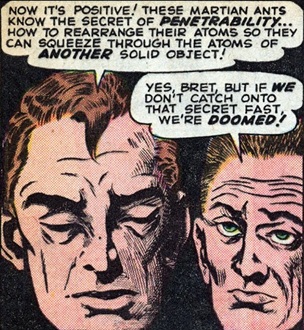 When the first spacecraft from Earth landed on their planet, the Martians captured astronauts Bret Hoff and Dan Squire. Believing that the strangers who could devise such a fantastic spacecraft to reach their world could also discover the ants unsolved secret of "penetrability," the Martians put them in a glass-topped maze. They provided the men with at least four of their world's ants, along with a smaller model of the maze in which the astronauts were trapped; they tasked the men with placing the ants within the smaller maze and observing them, so that they could learn the secret of the ants' power of "penetrability," and thereby teach the Martians about the method the insects used.