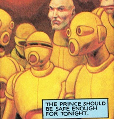Royal Palace on Jewelworld. (Marvel Graphic Novel#3: The Metamorphosis Odyssey Book Three: Dreadstar) - After his arrival, Dreadstar returned to his old uniform and headed toward King Nellor. A pair of Mach 6 entrance cyborg guardians stopped him and requested identification; after Vanth identified himself as Captain Dreadstar and noted that he had an urgent message for his majesty, the guards noted that his majesty was no longer receiving, and they asked why he was out of uniform and informed him that central filing reports that he had no clearance for that section of the palace. The one guard informed him that they would have to delay him until security could...but Dreadstar then struck, decapitating that guard before it could say another word and decapitating the other guard just after it had shouted, "Security alert." (Marvel Graphic Novel#3: The Metamorphosis Odyssey Book Three: Dreadstar - BTS) - Dreadstar slew King Nellor. --Marvel Graphic Novel#3: The Metamorphosis Odyssey Book Three: Dreadstar Note: Mach 7 guards were a lot more deadly than the previous Mach 6. |