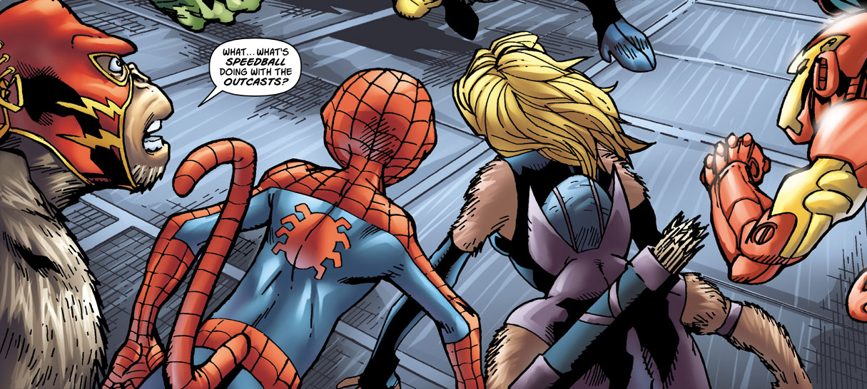 Later that night, as Fitzhugh was forced to activate the portal to Earth-616, Ms. Marvel and the others glimpsed their human counterparts on giant screens before Captain America delivered an enigmatic speech rallying his forces for invasion. Just as the portal was to be opened, the Outcasts, a group of rejected super-simians, arrived in force. Ms. Marvel and the Ape-Vengers clashed with them until the original Captain America, saved by the Outcasts, revealed himself and exposed Baron Blood's deception. When the vampiric Invaders appeared, the Ape-Vengers and Fantastic Four allied with the Outcasts to battle Blood and his forces. In the climactic battle, Fitzhugh and the Gibbon returned to their home-reality with the gravely wounded Speedball, after which Ape X slew Baron Blood, destroying the portal in the process. The blast tore apart part of the Ape-Vengers Tower, but the heroes emerged victorious.