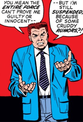 (Captain America I#159) - Muldoon and Courtney tried to force Rogers to confess that he was the Cowled Commander when he woke up. Muldoon knew that something was going on with Rogers because he received all that special treatment and often skipped duty while honest cops like him got suspended. He knew that Rogers was still probably feeling a bit woozy and left with Courtney to give Rogers some time to figure out what they would do to him if he didn't confess.