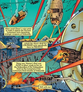 (Black Panther III#28) - Atlantis dispatched their own vessels to surround the N'Yami-Class Mother Ships and warned if Wakanda opened fire, the Atlanteans would attack them. Unfortunately for all concerned, Klaw invaded Lemuria and readied the city's missile launchers to open fire. The crews of the N'Yami-Class Mother Ships opened fire on the Atlantean ships to disable their weapons then fired on the Lemurian missile silos to prevent them from launching. Consequently, the firefight T'Challa had hoped to prevent had begun.