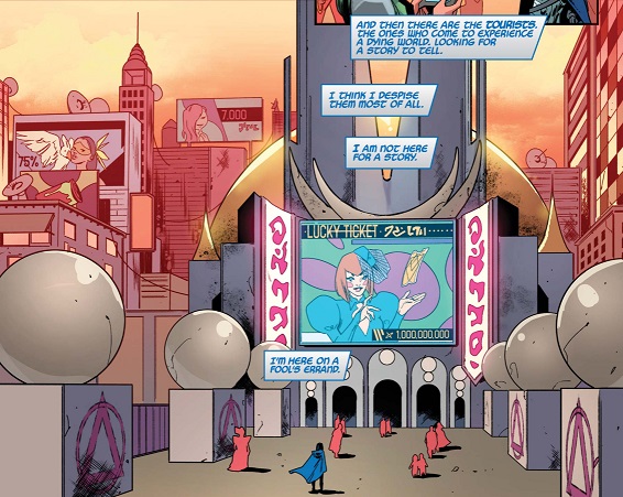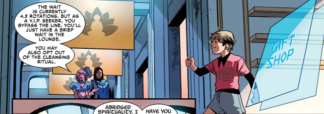 bead, a tattoo, make-up, or otherwise) between her eyebrows.(The Mighty Valkyries#1) - Arriving at Oracle Adventures, Runa was greeted by the receptionist, "Welcome to Oracle Adventures, where mystery ends. How can I help you." Holding out some sort of "gold card," Runa asked if this would get her the V.I.P. package. Her attention gained by the VIP request, the receptionist asked Runa to please give her a moment, after which she stuck her head through the curtain behind her. The receptionist swiftly returned, confirming that they had a VIP seeker package ready for her tonight. She then introduced Juna, who would be Runa's personal guide as she sought her authentic truth. She further noted that Juna had a voucher for 15% off at their gift shop. --The Mighty Valkyries#1 Note: Bummer that she did not receive a name. I would suggest "Rice" (pronounced like Ricky) |