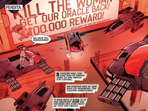 place.This was for the Oracle's protection, of course... The security guards wore headgear that seemed to be somewhat patterned after the false form worn by Kvasir as the Oracle; it would seem that this headgear would have severely limited their peripheral vision. Security agents also manned a number of airships to intercept beings attempting to escape by air. (The Mighty Valkyries#1) - Asking more than one question alerted the guards, but the Oracle confirmed that she was there because of a promise made to the woman she loved, a woman that he had raised; that he was indeed Kvasir, the one she sought; and that her name was Runa. As the guards ordered her to step down from the podium and noted that she had three seconds to comply, Runa summoned her axe, Jarnbjorn, and prepared to break the magic dome imprisoning him. (The Mighty Valkyries#2) - As the dome shattered, the disguise that had hidden and shielded Kvasir faded. Virtually blinded by this sudden release, Kvasir was initially limited and vague in guiding his and Runa's escape. ![]() While the security agents' presumed leader instructed care to avoid hitting the Oracle, Oracle/Dreamworks broadcast "10,000 Rublins to the one who slaughters the woman" (referring to Runa)...and "20,000 to the one who caught her alive. We'll have ourselves an execution!" Kvasir noted an "egress in disguise" behind them, which Runa -- while blocking an energy blast -- correctly interpreted as a door, and she carried him through it. As he warned her to beware the "fox...in snow," she, annoyed, asked him to tone down the obscurity. Kvasir noted that there was death on every path, and Runa clarified that she meant one where she and he survived but that their opponents did not. Runa subsequently recognized and took out the foxy woman wearing white from Kvasir's previous reference, after which Kvasir advised her to go left. Runa noted her appreciation for clear instructions, and Kvasir continued with specific guidance, leading her to kick open a door to exit the building. It was then broadcast that Dreamfresh had contributed another 10,000 Rublins to the reward, "Kill the woman, get our Oracle back, and remember: Healthy skin is wealthy skin!" Kvasir then directed Runa toward some stairs to escape the "fox in snow," after which he advised her that a man named Ologen was behind a door and would kill her unless she... Appreciating Kvasir's meaning, Runa cut him off and kicked through the door and into Ologen, knocking him into waterway. As they reached Runa's ship, Runa noted that Kvasir had been wrong as no one had died, but Kvasir explained that Ologen would be dead from the irradiated waters in hours. As they lifted off, they were confronted by at least a pair of Perdita/Oracle security ships. (The Mighty Valkyries#3) - As Dreamfresh/Oracle Adventures broadcast an increase to a 100,000 Rublin reward for killing the woman and recovering the Oracle, Kvasir instructed Runa to go straight up: There had been a reactor explosion in sector four and that if they maintained their current trajectory, they would hit the fallout and be reduced to a bubbling mess of flew and hair in seconds. Runa's ship evaded and/or destroyed various pursuing ships, and she escaped with the Oracle to Vanaheim. --The Mighty Valkyries#1 |