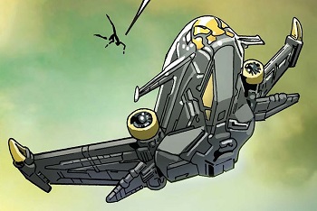 (Symbiote Spider-Man: King in Black#3) - When Spider-Man was flung off of the Wayfarer Quinjet as the shadowy Mister E piloted it off-Earth, Rocket had the Rakk'n Ruin II pick up the falling Spider-Man and the hero was brought onboard, only to kick Kang when he recognized the villain. A fight quickly ensued between Spider-Man and Kang while Rocket tried to continue flying the Rakk'n Ruin II but the fight was eventually broken up when Kang proved his intentions by showing Spider-Man the recovering Black Knight in the ship's healing bay. Kang then explained the threat of the shadow creatures by showing Spider-Man one of the captured creatures that he intended to separate from its host and eject into the sun. When the Rakk'n Ruin II flew close enough to the sun, Kang did just that, revealing the creature's host to be the heroic Captain Marvel, who immediately attacked Kang just as Spider-Man had. The foursome then discussed why Mister E would want the Black Knight's Ebony Blade and where he might be taking it to destroy it, at which point Captain Marvel suggested he might take it to Knowhere.