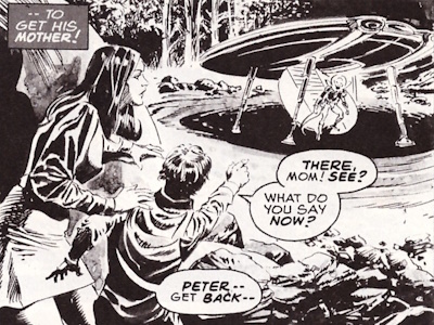 In the original Star-Lord story, the aliens who killed Meredith Quill were pretty much a mystery. We readers weren't told who they were or why they had come to Earth and, while it seemed likely that they had killed her in order to keep their visit a secret, the story didn't explain why they didn't also kill Peter, the other witness, or why they then quickly left the planet without apparently doing whatever they had come to Earth to do. Meredith Quill's death was presented as a case of her being in the wrong place at the wrong time, and it was basically bad luck that her son had just happened to see a flying saucer land while he was walking alone in the woods and had then brought her to see it. The fact that the landing rockets of the flying saucer Peter saw blasted the ground beneath them, presumably leaving burn marks similar to the "strange, charred circle" that Peter had found on a far valley floor while walking in the woods in the spring of 1971, was probably meant to indicate that the aliens may have visited the area before, as remembered in local stories from 1930 about when the spacemen had landed.
