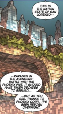 (Wolverine & the X-Men II#2 (fb) - BTS) - San Lorenzo was devastated during a battle between the Phoenix Five and the Avengers. It should've taken decades to rebuild, but the Phoenix Corporation rebuilt it overnight.