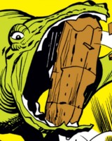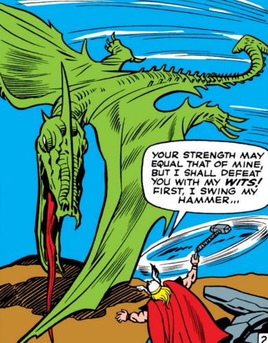 (Journey into Mystery I#103/3) - In the Land of Mirmir Thor was attacked by the flying dragon Skord. Thor launched a large boulder and it got stuck in the dragon's jaw. With the dragon incapacitated, Thor continued his journey.