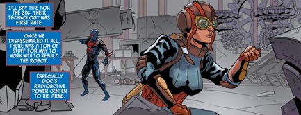 (Spider-Man 2099 II#8) - After Lady Spider (May Reilly) and Earth-928's Spider-Man 2099 discovered the wrecked robot Leopardon of Earth-51778, they returned to Lady Spider's Earth-803 home reality and May Reilly approached Lord Harold Osborne in hopes of using the Stadium to secretly repair Leopardon. Lord Osborne admitted that he would have to ask his father's permission to use the Stadium but he eventually agreed to ask his father in exchange for the chance to take May Reilly out to dinner. After successfully getting permission from his father, Harold granted Lady Spider and Spider-Man 2099 access to the Stadium. The two spider-themed heroes then transported the wrecked Earth-51778 robot Leopardon into the Stadium and they began work to rebuild the robot. Unaware that his father was the villainous Green Goblin and that he was planning an attack on Lady Spider at the Stadium, Harold eventually ventured inside the Stadium, curious as to what the two spiders were working on. Moments after he was shocked to see Leopardon, the Six Men of Sinistry (led by the Green Goblin) attacked Lady Spider within the Stadium. The two spiders ultimately defeated the Six Men and used their technology to complete their rebuild of Leopardon, soon after departing the Stadium to reconvene with the rest of the Multiversal Spider-Army.