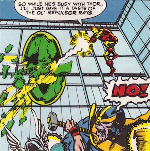 Another problem with the story in Captain Marvel I#57 is that Thor created a gateway to the Negative Zone by throwing Mjolnir so precisely that it hit first one and then the other of the Nega-Bands in quick succession. As far as I know, this is the first (and only?) time in which the Nega-Bands have been shown to be capable of opening a portal between the Earth dimension and the Negative Zone. Previous stories had always shown Mar-Vell and/or Rick Jones using them to exchange places between those two dimensions by slamming (or even just touching) the bands together. Why it would work if Mjolnir struck each band, without them striking each other, is a puzzle as well.