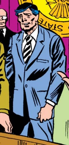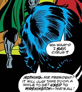 (Champions I#16) - Affected by Doctor Doom's neuro-gas, Secretary Cyrus R. Vance happily stood next to President Jimmy Carter as Carter turned his office over to Doctor Doom. When Carter incessantly talked about how happy he was to turn his office over to Doom, an increasingly annoyed Doctor Doom eventually exclaimed that he couldn't tell if they were obeying him due to the neuro-gas or their own self-interest before storming out of the room, prompting Jimmy Carter to turn to Cyrus Vance and ask what he'd said to offend Doom. Vance assured Carter he'd done nothing wrong and that it would simply take time for Doctor Doom to get used to Washington.