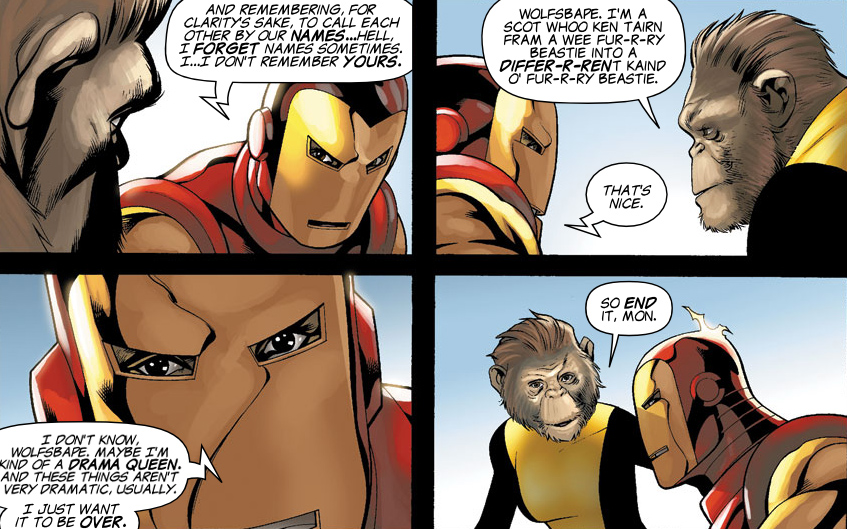 (Marvel Apes I#3/3) - Wolfsbape and the New Mutants joined a large force of assembled heroes, including Iron Mandrill, Captain America and the X-Apes, to oppose the Beyonder. Amidst the battle Wolfsbape noticed Iron Mandrill was hunched over dealing with his demons after quitting drinking and reminded him of who he really was after which Iron Mandrill unleashed a powerful energy blast that helped tip the battle, leading to the Beyonder's defeat.