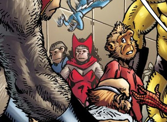 Group Membership: Ape-Vengers (Ape X/Roy Reyna, Black Widorangutan/Natasha Romanova, Black Panther/T'Challa, Captain America/Steven Rogers, Gro-Rilla/Hank Pym, Hawkape/Clint Barton, Huhr/Bruce Bananner, Iron Mandrill/Tony Stark, Juggermonk/Cain Marko, Monkey-C, Ms. Marvel/Carol Danvers, Quicksilver/Pietro Maximoff, Sandmonk, Scarlet Witch/Wanda Maximoff, Speedball/Robert Baldwin, Spider-Monkey/Peter Parker, Thorangutan/Thorangutan Odinson, Vision, Wasp/Janet Van Dyne)