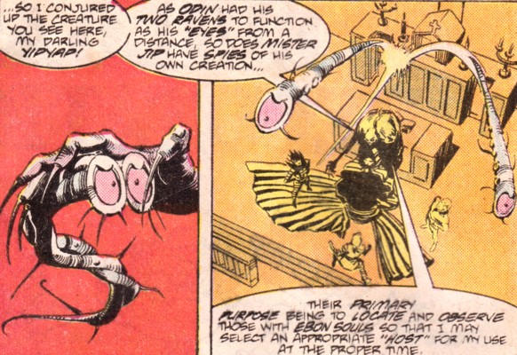 (Strange Tales I#11/1 (fb) - BTS) - Mister Jip conjured up Yipyap to serve as his eyes in the world like Odin's ravens. He sent the split up creature out to locate and observe individuals with dark souls that Jip could later use as a host.