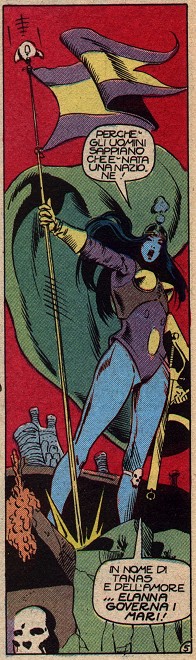 History: (Sub Mariner I#64/2) <6, 000 BC> - 12,000 years (see comments) after the Great Cataclysm that sunk Atlantis, Elanna followed the army of his husband Tanas. They reached the ruins of Atlantis to conquer its hidden treasures but had to fight with the army of the tribes of the Eastern Sea led by Stegor. Tanas was killed in duel by Stegor, but Elanna knew the result of the fight before its start. So, she mounted on her manta, took the command of the army and entered in the fight. Saving the Flag, she challenged Stegor and killed him, also this time, she had known the result of the duel before it started. She then led her people to the conquest of the ruins of Atlantis.