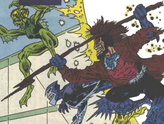 (Nomad II#7)- The doppelganger set out to find the real Gambit in Louisiana, but accidentally boarded a plane bound for Los Angeles. It slew the entire crew and passengers of the plane before it landed, and found a team of FBI agents waiting for it. It quickly slew one of the agents by hurling a charged-up diamond ring at one of them, then took another captive, tore out her heart, charged it up and threw it at the other agents.