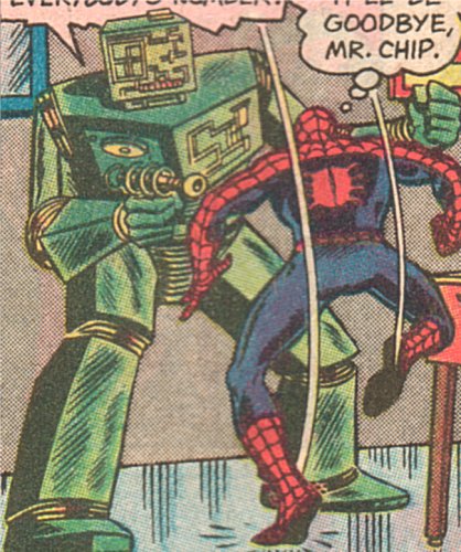 ("Spider-man vs. The Human Computer") - The Human Computer was using electronic sabotage against all of the computers in the city, but when he interfered with the kids' video games, Spider-Man decided he had gone too far! Swinging to the arcade, Spider-Man encountered the Human Computer, whom he tricked by offering some milk and Hostess Cupcakes. The hi-tech hoodlum's logic circuits were distracted by the chocolatey cake and fudgy icing. Spidey pulled off the Human Computer's helmet, revealing him to be just a man, and left him webbed up for the authorities to take into custody.