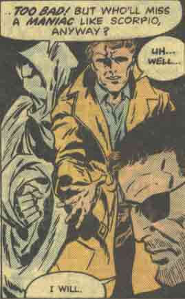 (Defenders I#49) - After Scorpio had captured Nighthawk, Nighthawk asked the LMD to set him free, thinking it was the real Fury, but the LMD refused. Later, when the LMD pointed out that it was Scorpio's fault that Moon Knight escaped, Scorpio lashed out at him angrily. He then revealed to Jack that it was only an LMD, not the real Fury