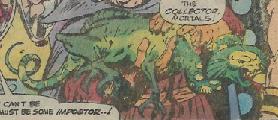 Comments: Created by Roy Thomas, John Buscema and George Tuska. Despite their names, I kinda doubt that the Venusian Retriever Anemone and the Jupiterian Sauro-Beast came from the Venus and Jupiter in the Sol system, but anything's possible. "Tokka" was never actually named, but he made the exclamation "Tokka borr!" I imagine that's his native language for "Tokka kill!". Profile by Madison Carter. CLARIFICATIONS: The Jupiterean Sauro-Beast was a small creature that The Collector treated as a cat-like pet. "Tokka" was a giant creature that escaped its captivity in the Collector's ship during the Avengers battle with the Robotoid. It grabbed the Wasp, but was quickly put down by one of Hawkeye's arrows. The Venusian Retriever Anemone was a shapeless mass that the Collector used to capture several of the Avengers. Once caught, the Collector shocked the creature, forcing it to let the unconscious heroes fall to the floor. images: