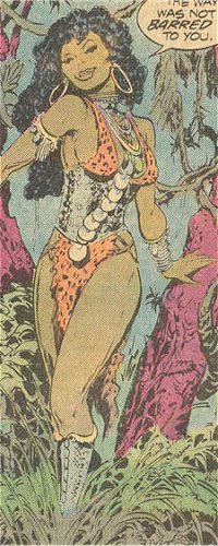 (Conan#82) - Conan was returning from Attalus to Harakht, the Hawk City, when he encountered a beautiful brown-skinned woman in the jungle. She asked why he was riding so late in the outlands. The woman told him that her brother had a hurt leg and could not walk, and that she was lost. She asked Conan to come with her to check on her brother and he agreed, although he knew deep down there was no injured brother. His uneasy feeling were due to the fact that the lady had cast a mild enchantment over him. Conan's strong will helped him snap out of it, but not before he was led into a trap and attacked by three armed Kushite men, whom he quickly defeated. The woman escaped.