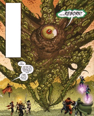 (Conan the Barbarian I#260 (fb) - BTS) - At least 1000 years before the sinking of Atlantis, Shuma-Gorath found his way back to Earth and set himself up as a god again, this time on what would become Mount Crom in Cimmeria. He was fed by blood-sacrifice, from both tribal warfare and ritual slaughter on his altar. Shuma-Gorath did not seek priests or intermediaries between him and his food; he destroyed any shaman who sought to curry his favor. For an age it ruled over the humans until they cried out to a newly arisen god: Crom. Crom sent a great storm which a shaman of the Northmen entered. He returned with three iron-bound books, locked by a key. (This is millennia before books existed.) The Shaman read the books to his tribe and then went off to confront the demon.