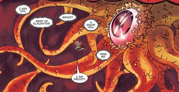 (Invaders Now!#4) - In Vlieth the Invaders and Uberkommando witnessed Shuma-Gorath slither through the portal opened by the old man's ritual. The demon got hold of Namor and Human Torch while Toro threw fireballs at the demon.