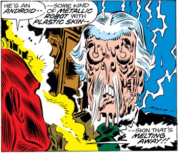Adam-II's red skin reminds one of the Human Torch's diverged self, the Vision.