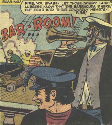History: (Kid Colt, Outlaw#109) - The Barracuda assaulted the town of Pecos Hill with his cannons, and sent men ashore to collect new crewmen. Kid Colt, on the run from the law, decided to stowaway on the Barracuda's ship to escape, but when the Barracuda found him, he ordered him to walk the plank.