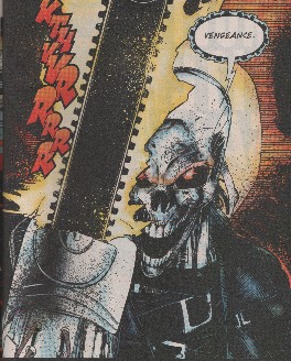 (Ghost Rider 2099#22) - Anesthesia Jones and Kylie Gagarin took out Kabal, but Vengeance overpowered Ghost Rider 1.0. Before Vengeance could finish him off, SHIELD forces arrived and referenced him as marshal. Unable to accept that Ghost Rider was a legal authority and that he (a former CSS agent) was the criminal, Vengeance's system crashed and he fell to the ground inert. Ghost Rider then quit as marshal, vowing to fight the "pusbags responsible for this sick excuse for a world."