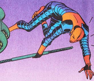 (Peter Parker: Spider-Man II#16) - In their first outing as supercriminals, Ms. Fortune and the Squid attacked Spider-Man on a rooftop. Ms. Fortune didn't even manage to hit Spider-Man before he grabbed her staff and tossed her, along with the Squid, off the roof.