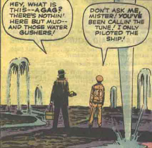 Charlie was surprised to find nothing but mud and geysers on the planetoid. He tested the water with chemical tests, but found nothing special about it. Finally he drank some to be sure it was water. He became frustrated, and did not realize that the water was having an immediate effect upon him. As the pilot watched, Charlie shrank into the form of an infant. It seems that Planetoid 12's great treasure was that its water was a veritable Fountain of Youth.