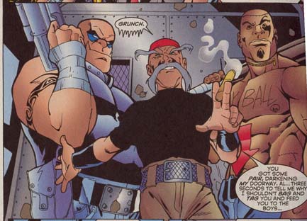 (Deadpool III#30 (fb) - BTS) - With Deadpool gone, the Hellhouse attracted an unruly element nd the mercs became more loyal to the absent T-Ray than to Patch.