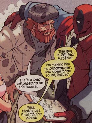 History: (Deadpool III#65) - Having somehow found his way into the DP Inc. headquarters, the homeless man was given a job application on which he repeatedly wrote the word "Ratbag". This impressed Deadpool who immediately hired him as his biographer. Soon Deadpool got a call to kill someone in Germany and decided to bring Ratbag with him. As Wade entered a castle to do his job, not realizing he was being set up by the Black Swan, he had Ratbag wait outside. When the Swan had Deadpool's broken and unconscious body brought back to D.P. Inc. he brought Ratbag as well.