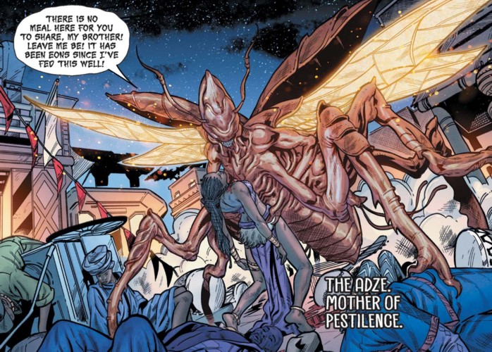 (Black Panther: Blood Hunt#1) - The Adze aka. Mother of Pestilence attacked Birnin Zana in Wakanda during the long night (a ritual by Varnae that blocked out the sun). She feasted on Wakandans until she was attacked by the Black Panther, who had been turned into a vampire by Varnae. She asked him to just let her feast, but got injured by his spear and eventually took off while cursing Black Panther for not allowing her to fill her belly. Black Panther knew that she would heal and likely return soon. --Black Panther: Blood Hunt#1 Notes: This creature is presumably the source of the Adze vampire strain or at least their leader/queen. The people attacked by her presumably turned into Adze eventually. With her enormous size it is unclear if she can shapeshift the same way other Adze can. |