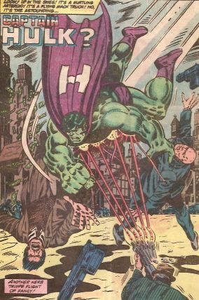 Powers/Abilities: Presumably, Captain Hulk possesses all of the strength of the Earth-616 Hulk, but can fly as well. His intelligence level is unrevealed, but this may have been an intelligent Hulk.