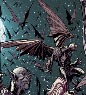 In Fear Itself: Hulk vs. Dracula#1 a vampire that is not a Charniputra was apparently the one that sent the Charniputra into battle with the Hulk. The Charniputra within the war council was right next to him and was even drawn with his mouth open like he was also supposed to have some dialogue while the other vampire mentioned launching two flights of Charniputra. Maybe both characters were supposed to have a speech bubble attached to them and the one with the Charniputra comment was accidentally attached to the wrong character? It just seems weird to me that another vampire would command the Charniputra when a Charniputra is standing right there. If my assumption is correct, this would mean that the Charniputra in Dracula's war council is named Karrik. |