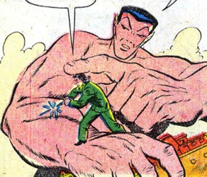 Namor, now taller than a mountain, realized if he didn't stop growing, there wouldn't be enough room on the planet for him and he'd fall off into space. Spotting a yacht nearby, the Sub-Mariner thought there might be a doctor on board who could help him. Namor picked up the yacht with his hand and -- lo and behold! -- he saw it was the yacht of Doctor Dill! Namor threatened Dill, telling him that if he fell off the planet, he'd take Dill with him ("Poetic justice, eh?"). With his scheme falling apart, Doctor Dill had no choice but to inject Namor with the antidote, returning him to his normal size.